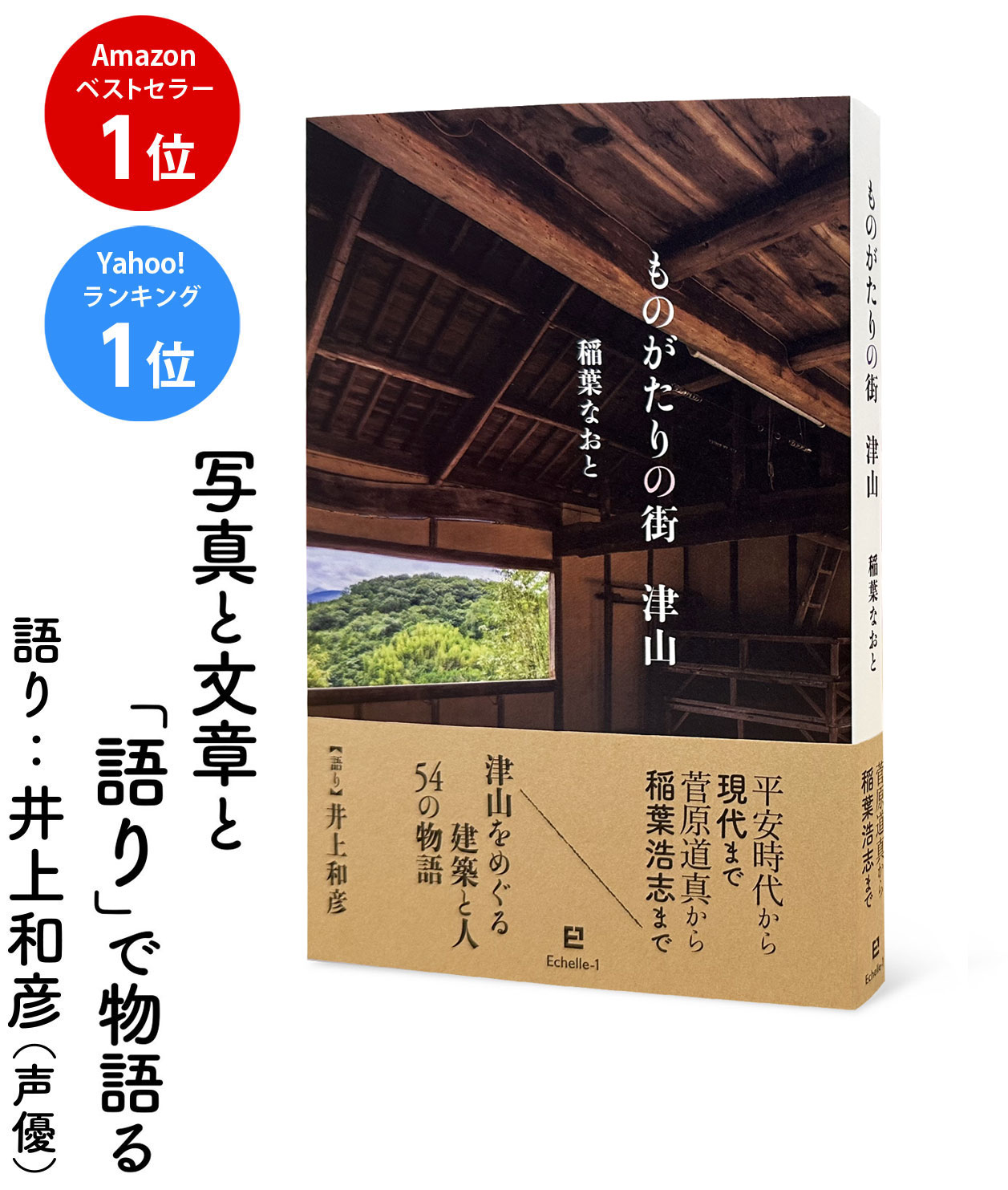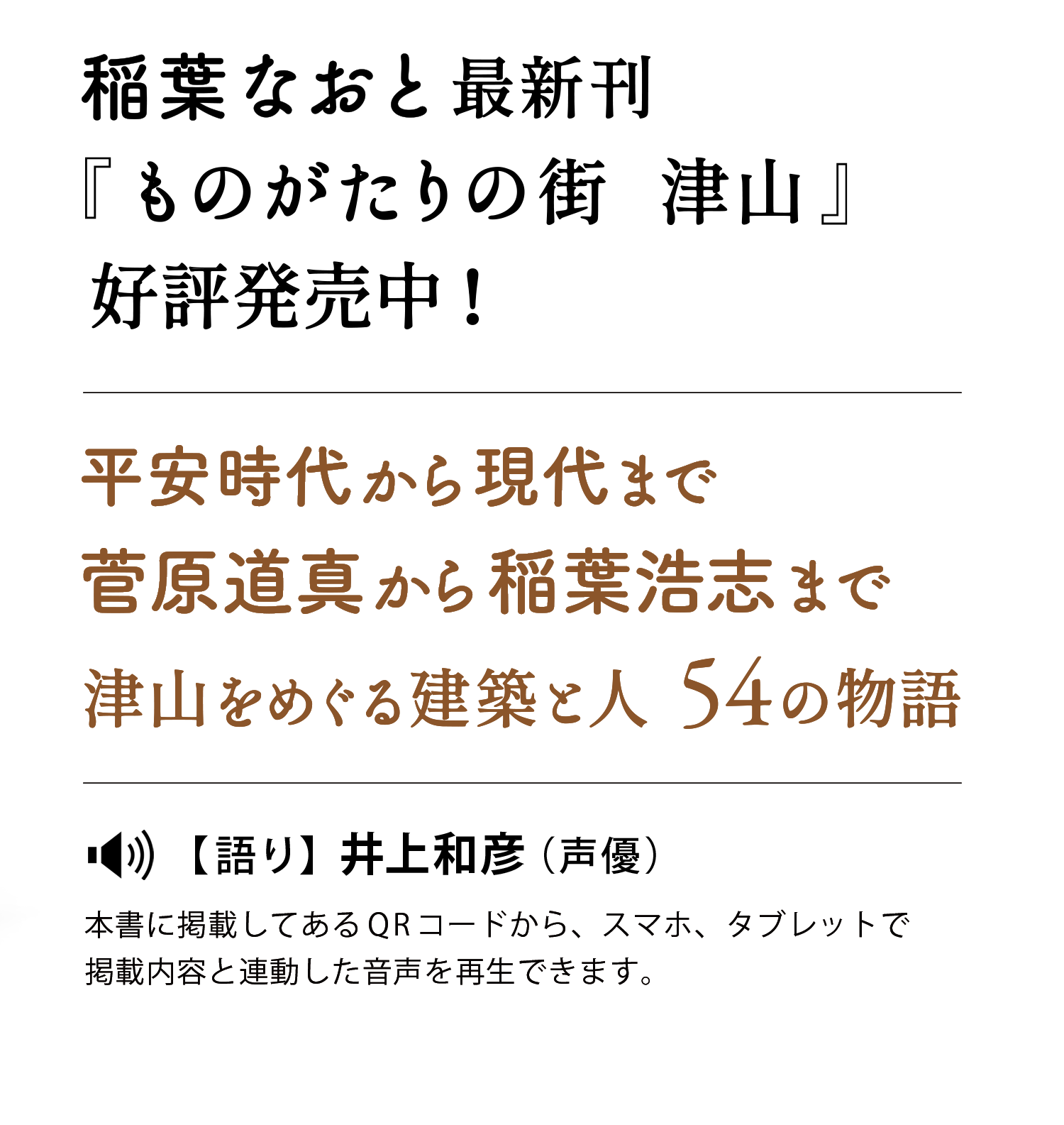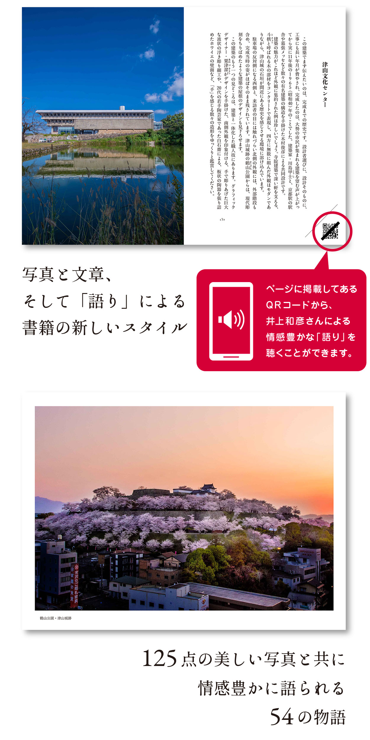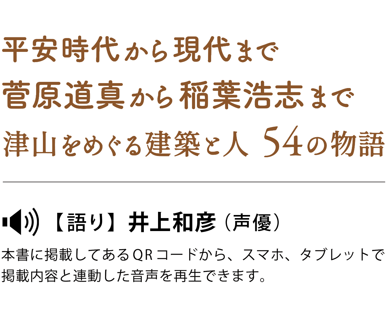 本書は54件の、建築作品及び津山ゆかりの人物を取り上げ、歴史的な背景やエピソードをわかりやすく伝えます。QRコードから再生できる音声ガイドは声優界の大御所・井上和彦氏が情感豊かに語ります。