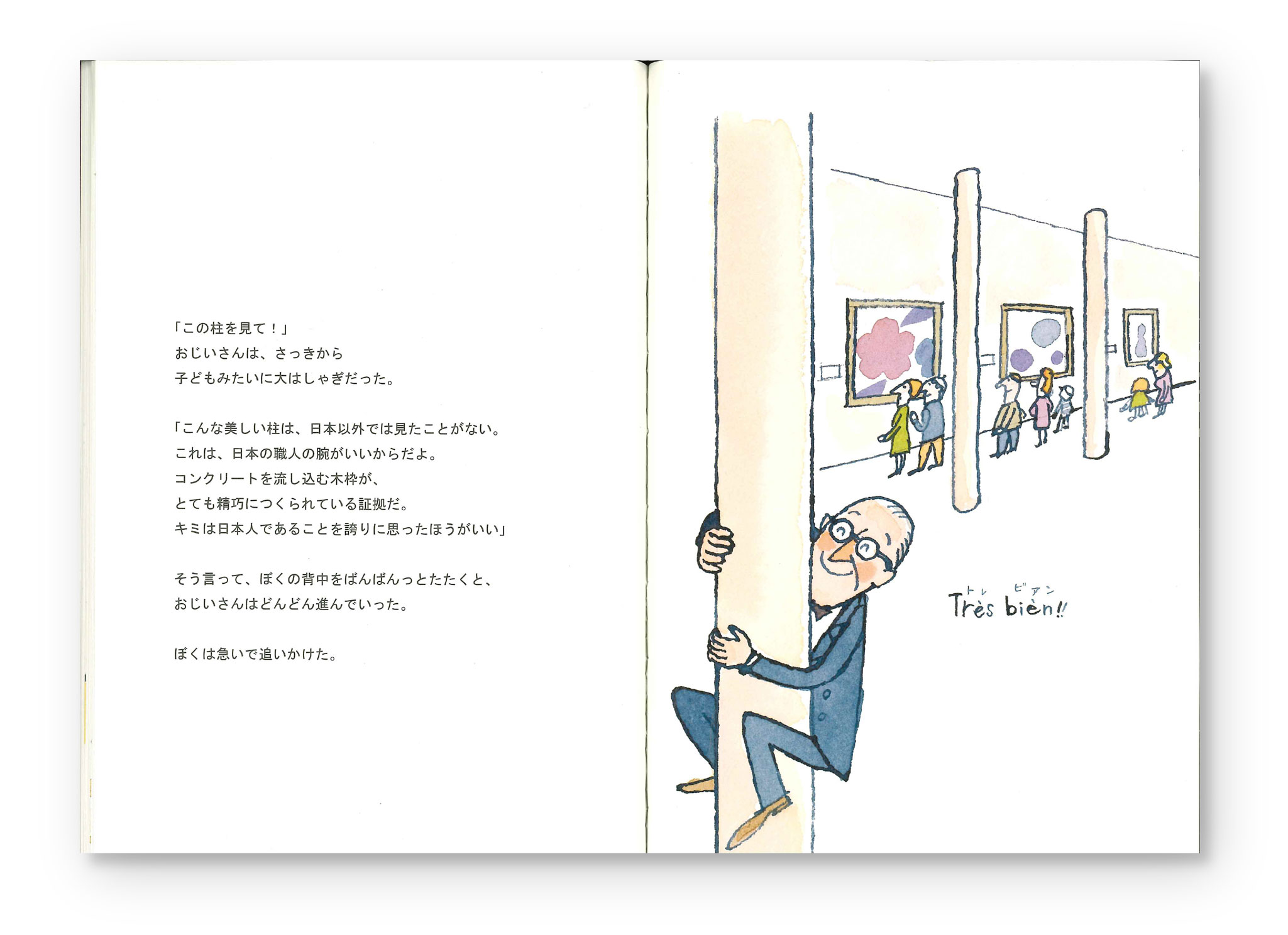 この初老の男性こそが、ル・コルビュジエ本人であった。彼は、美術館は「世界を観るもの」として、世界中から文化が集まり、そして無限に成長していくものであるという自身の建築観を語り、そして、「光が大切である」と少年に説く。二人の温かみのある会話から、ル・コルビュジエが国立西洋美術館にかけた想い、芸術観を読者に絵本という形態でやさしく伝える作品に仕上がっています。