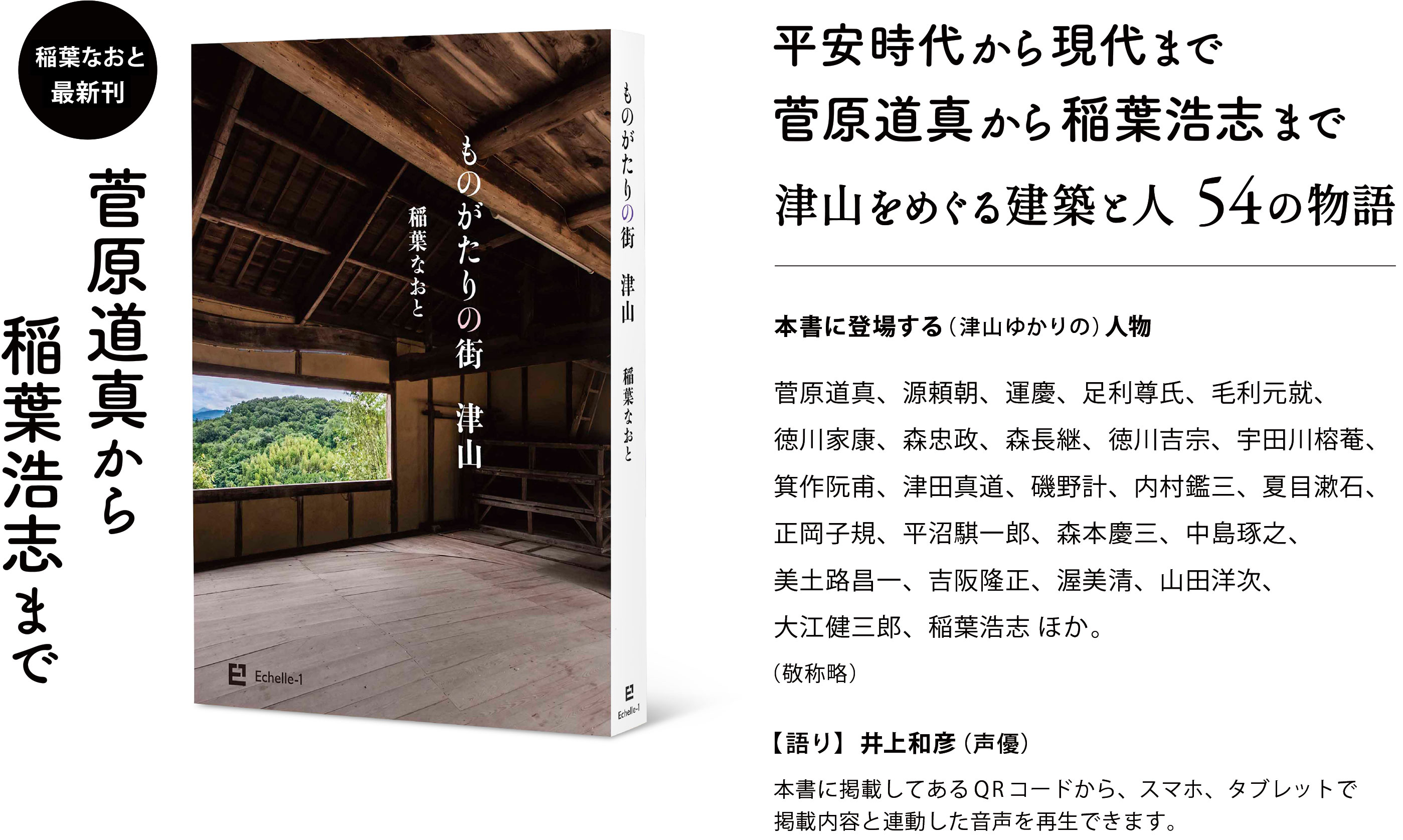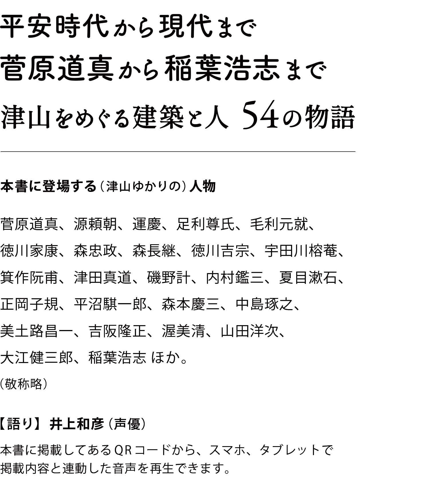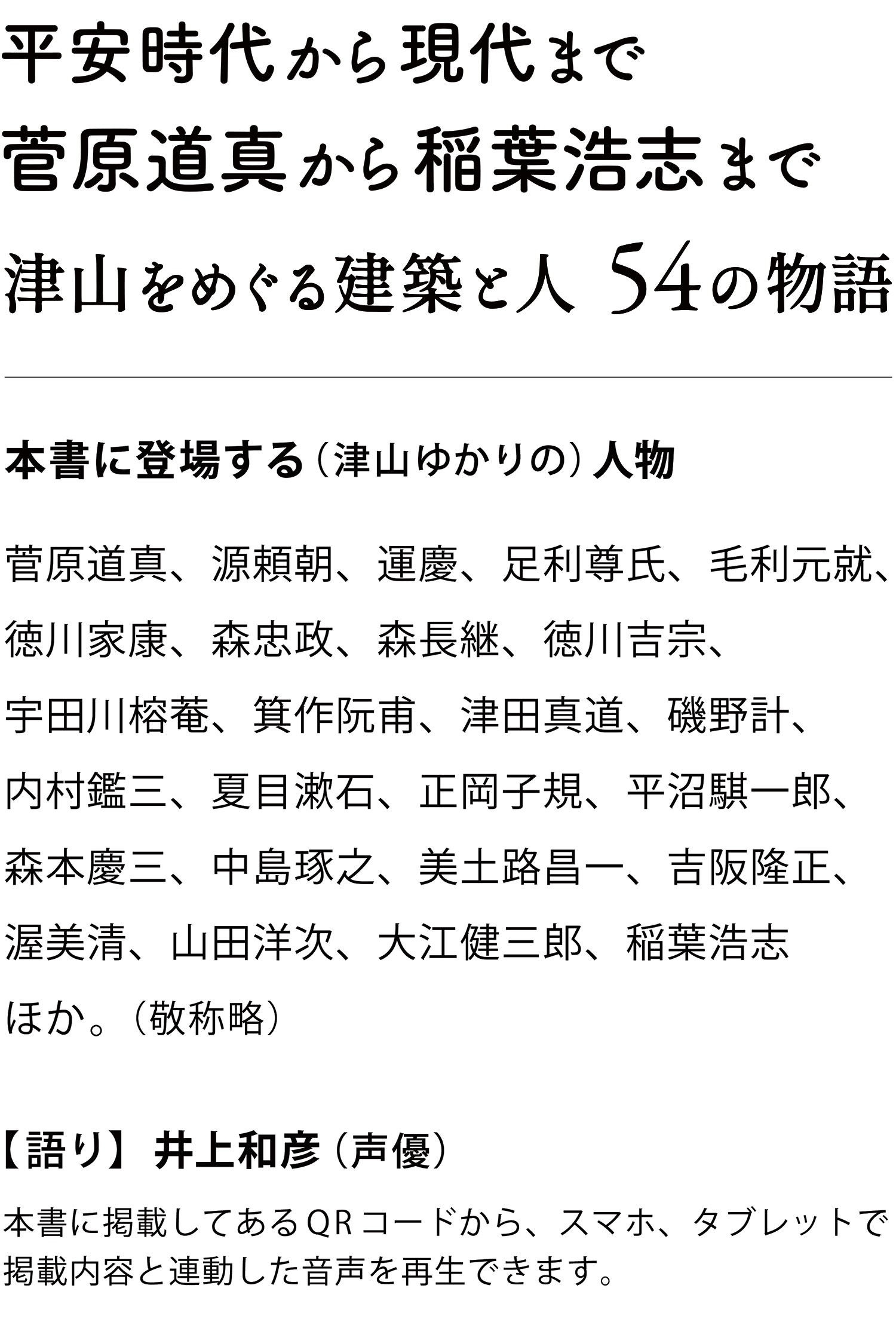 本書は54件の、建築作品及び津山ゆかりの人物を取り上げ、歴史的な背景やエピソードをわかりやすく伝えます。QRコードから再生できる音声ガイドは声優界の大御所・井上和彦氏が情感豊かに語ります。